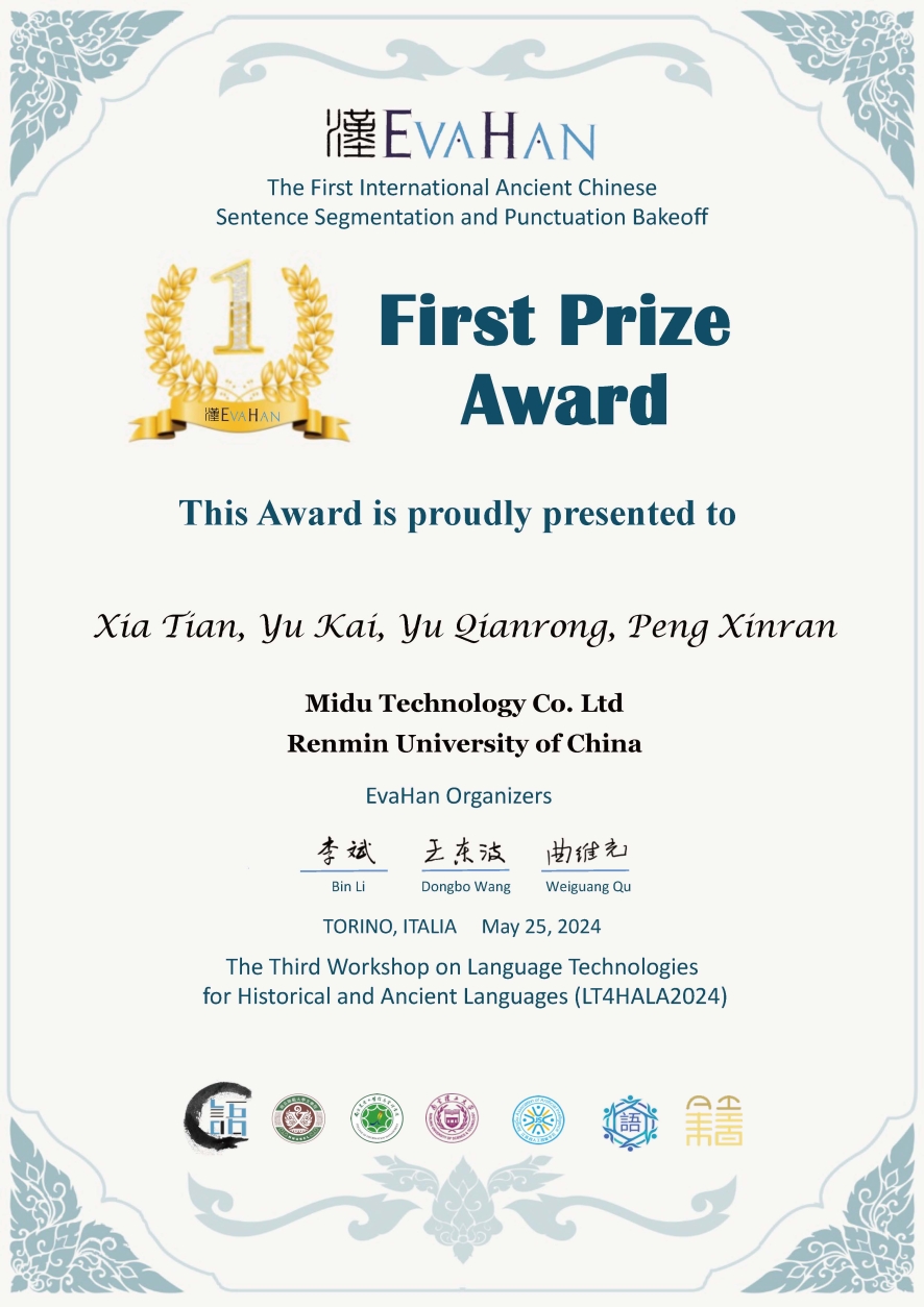 2024年5月25日,由中国人工智能学会(CAAI)主办的首届古汉语断句和标点国际评测会议(EvaHan2024)在意大利都灵举行,该会议在国际语言资源与评测大会与计算语言学顶会LREC-CoLing2024的子会议——国际古代语言处理研讨会(LT4HALA)上以线上线下结合的形式举办。