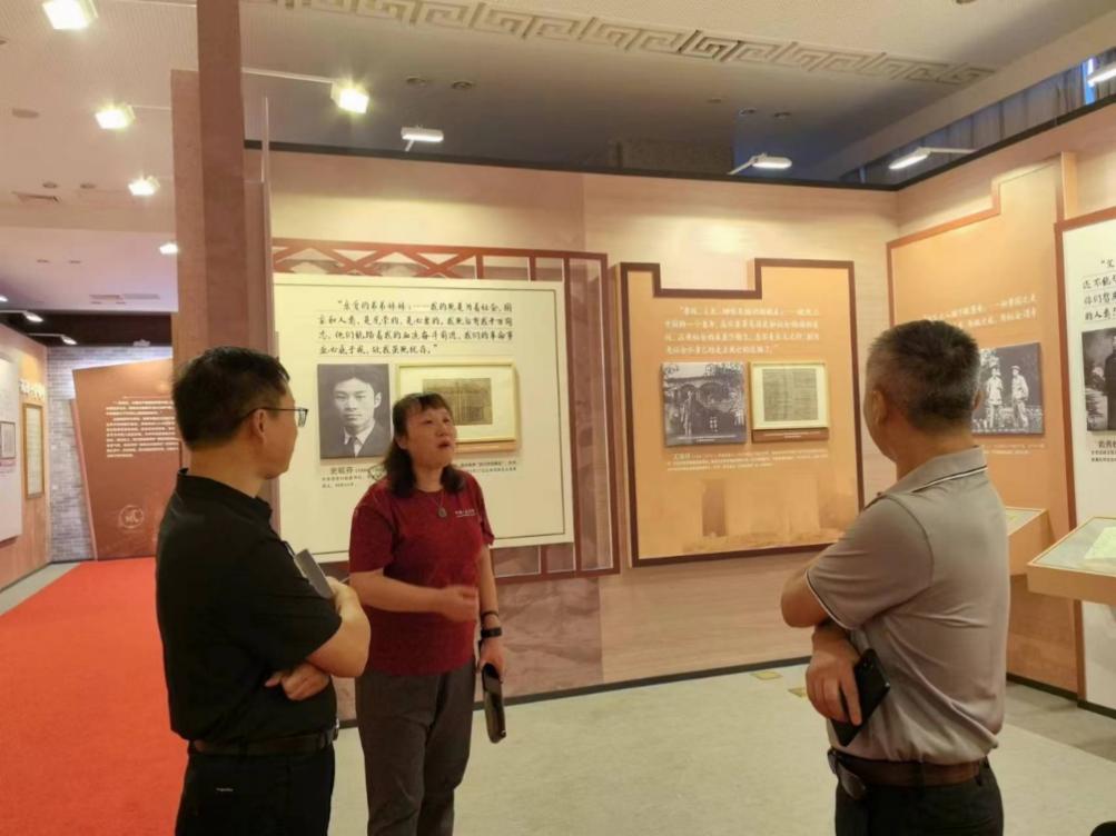 调研团首先来到江苏省档案馆,作为省级爱国主义教育基地,保存了明清档案、民国档案、革命历史档案和新中国成立后的档案四大部分,馆藏《韩国钧朋僚函札》档案、《南京长江大桥档案》和《民国江苏司法档案》被列入《中国档案文献遗产名录》。在江苏省档案馆接收保管处处长蔡和、业务指导处一级调研员刘鸿浩的陪同下,团队成员参观了“书信家园 尺牍情深——弘扬伟大建党精神·长三角档案联展”,以提升对档案馆工作的了解,增进对红色精神的认知。黄霄羽教授现场教学,为员工介绍档案背后蕴含的故事,更生动地展示了红色记忆,加深了同学们对档案工作的重要性及红色文化的内涵理解。