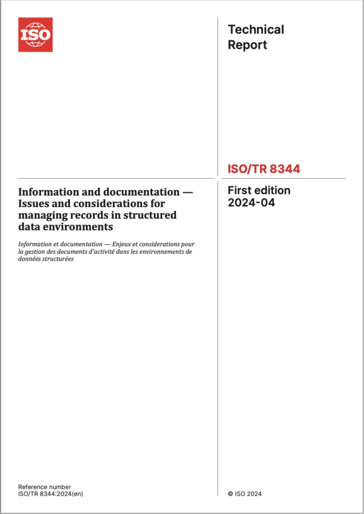 2024年4月15日,国际标准化组织正式发布ISO/TR 8344:2024《信息与文献 结构化数据环境下文件(档案)管理的问题及应对》(Information and documentation — Issues and considerations for managing records in structured data environments)技术报告类国际标准。