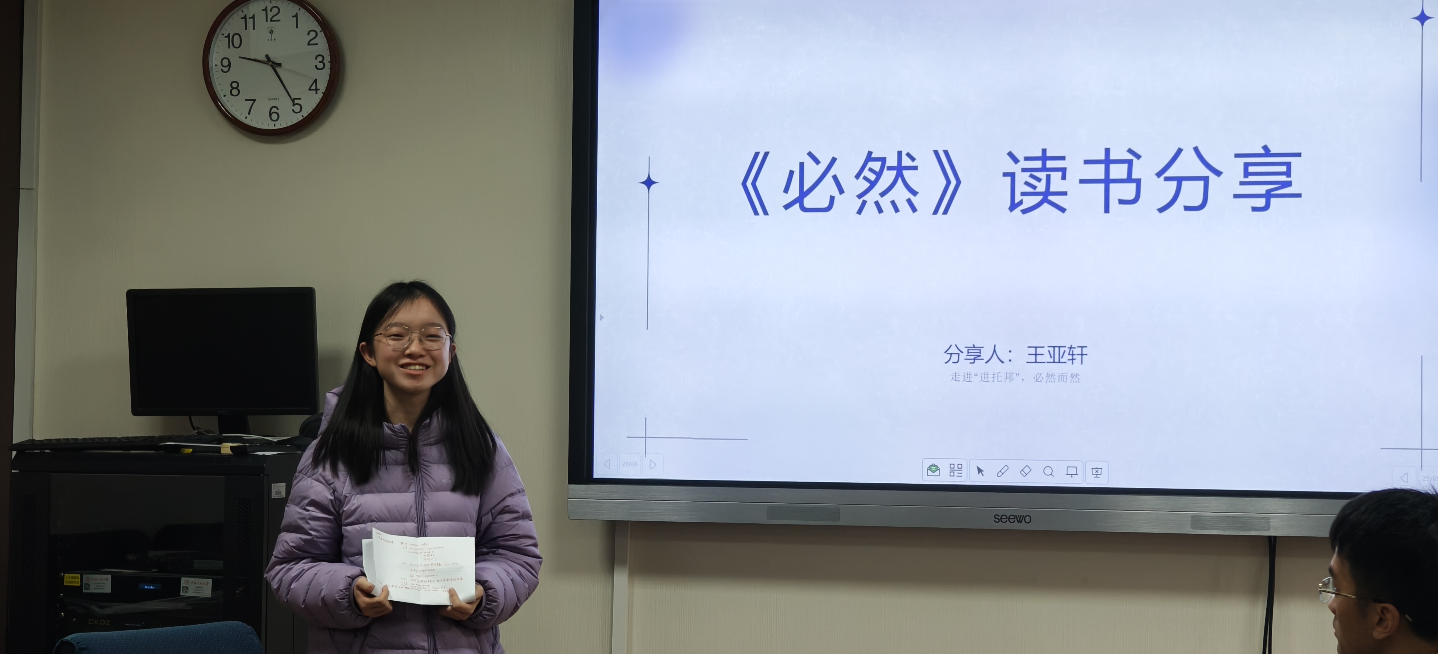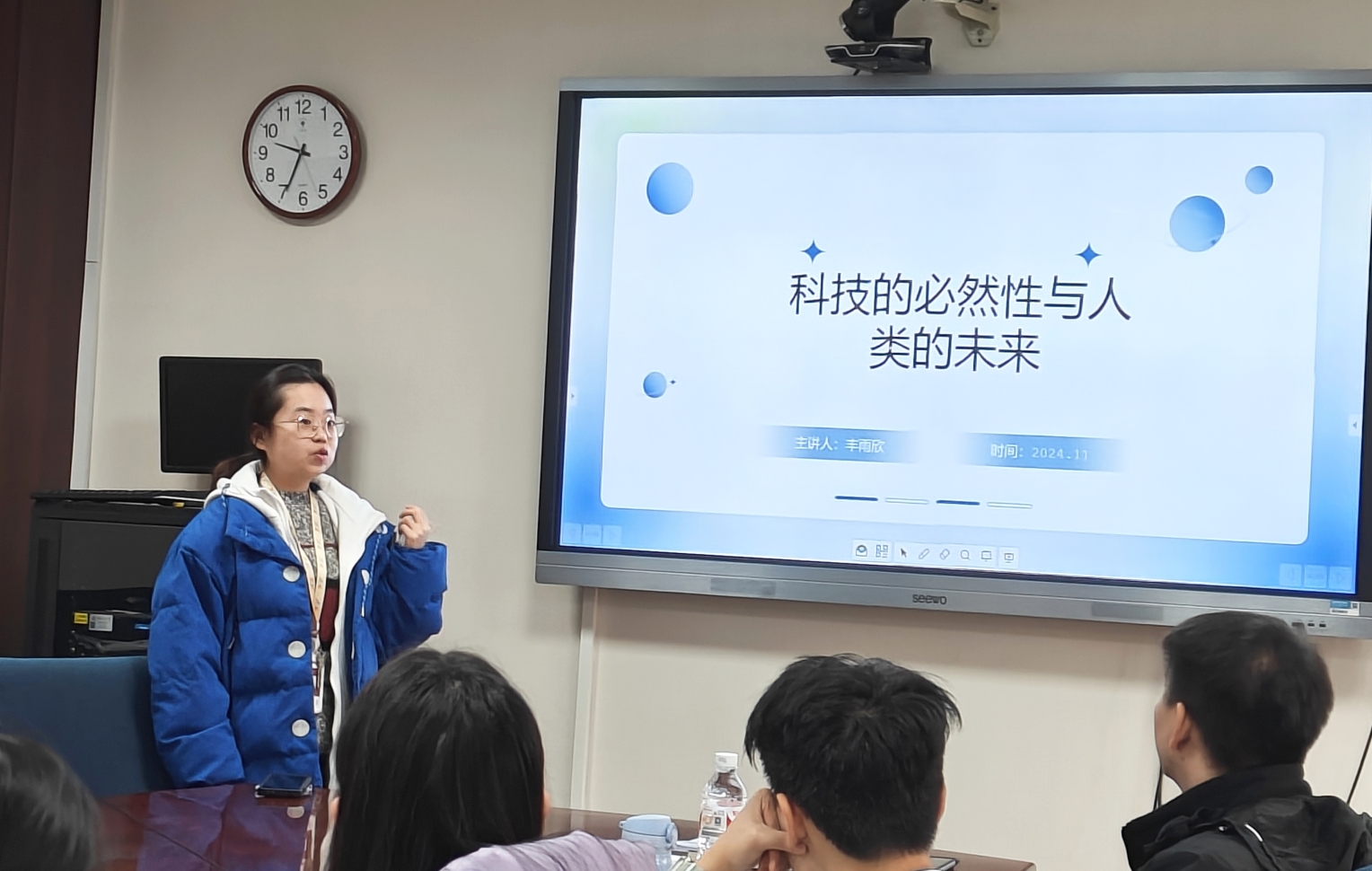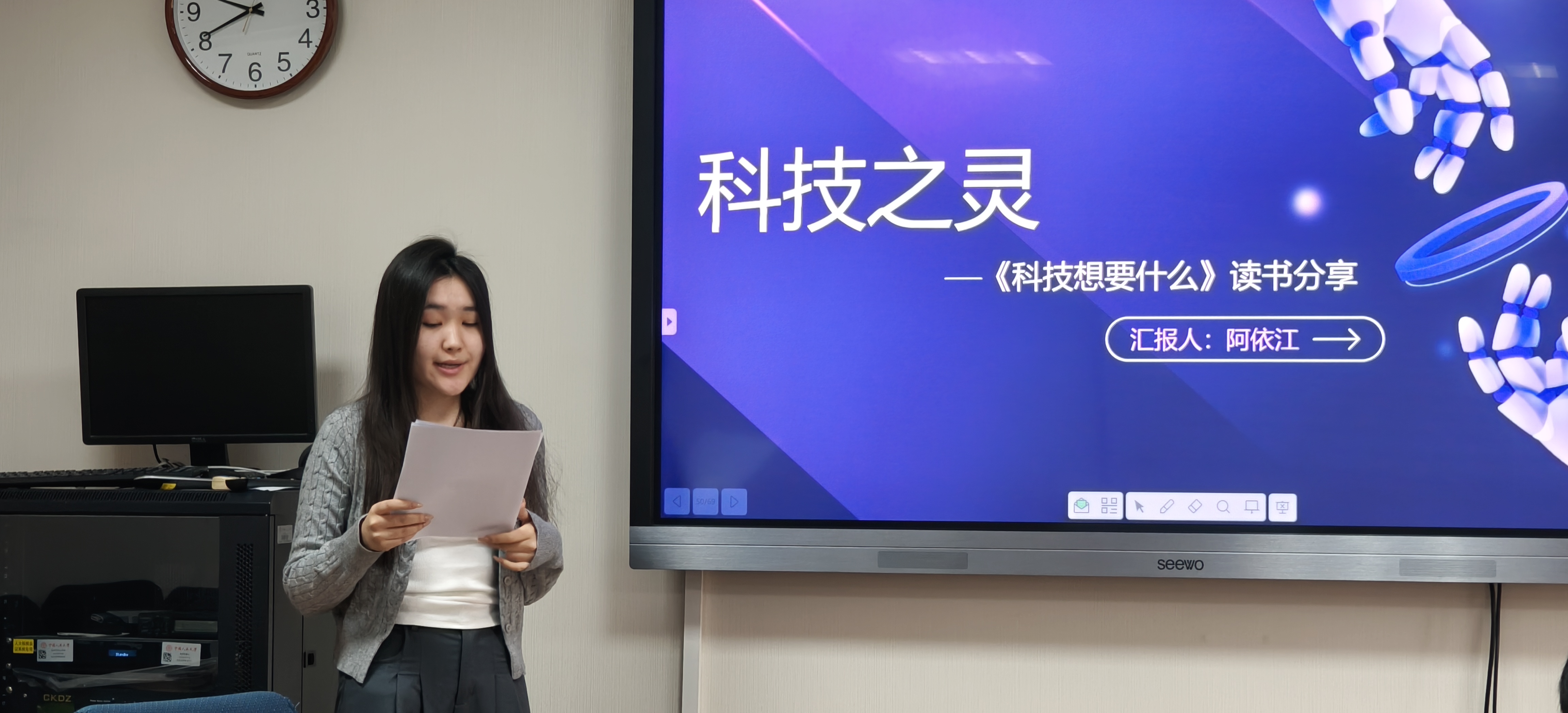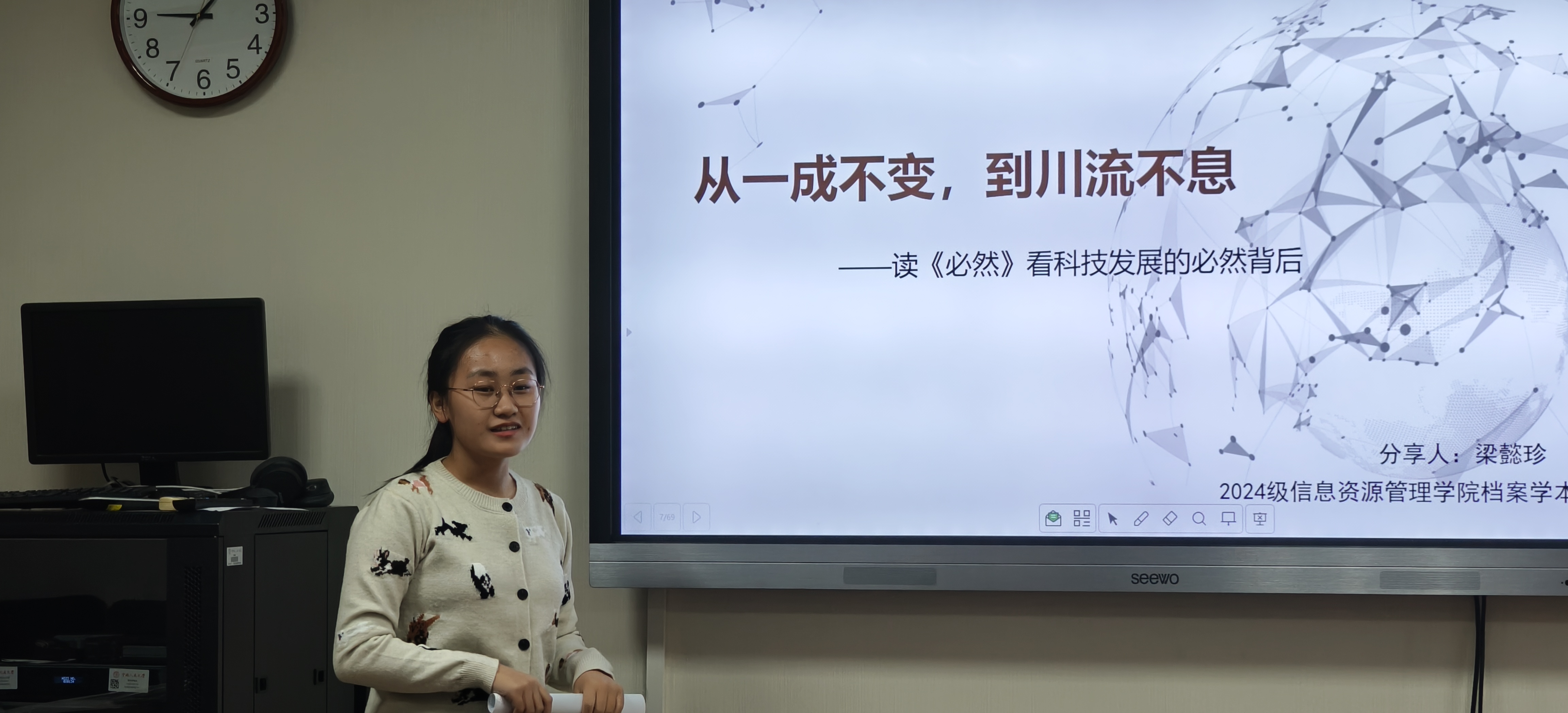 严承希对五位同学的读书分享给予了高度肯定。他基于人类科技发展历程,向同学们分享他对科技演变、人工智能等前沿议题的认识与理解。严老师强调在看待事情和处理问题时坚持唯物史观的重要性,建议同学们客观地根据唯物史观来审视历史发展和科技进步,要善于从人文社会科学视角审视科技发展相关问题,理性看待人类与科技的关系。最后,他鼓励同学们继续阅读相关书籍,进一步了解科技革新与广泛应用的必然性和发展趋势。