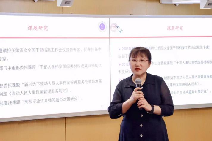 黄霄羽作了主题报告《人事档案知多少》,对员工档案、毕业生档案、毕业生人事档案等相近概念进行理论解读,梳理了毕业生人事档案管理的政策规定,并结合丰富的现实案例讲解了人事档案的价值功能和转递要求。报告既基于文献研究和政策文本明晰了人事档案的核心概念,区分了人事档案与个人档案的异同;又利用现实案例说明人事档案规范形成和管理的必要性,引导在场师生高度重视人事档案的重要价值。