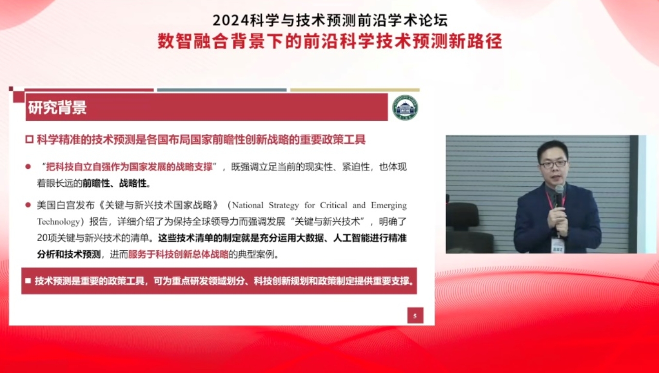 黄颖的主旨报告题为“从技术预测到技术预测评估:框架与方法”。他从国家政策需求、创新生态发展以及国际技术竞争的背景切入,强调技术预测在前瞻性战略布局中的重要作用。报告系统梳理了技术预测的概念和方法,区分了定性预测与定量预测的优缺点,强调对过去预测结果与实际发展的差异性分析是优化预测模型和方法的重要手段。黄颖指出,技术预测不应局限于面向未来的探索,还应从历史视角审视预测方法的演变,加强技术发展过程的检测和演化路径的识别,综合剖析技术的发展机理。