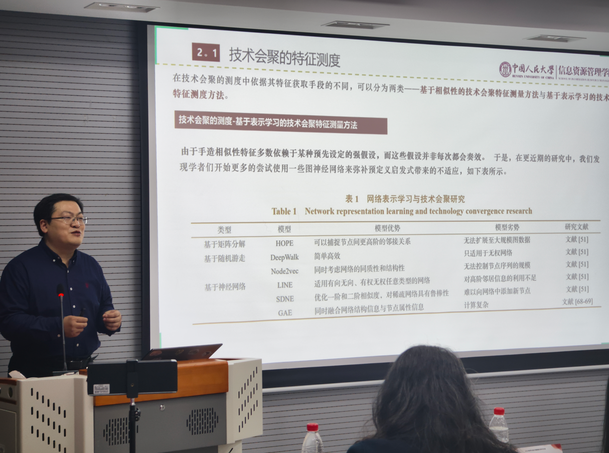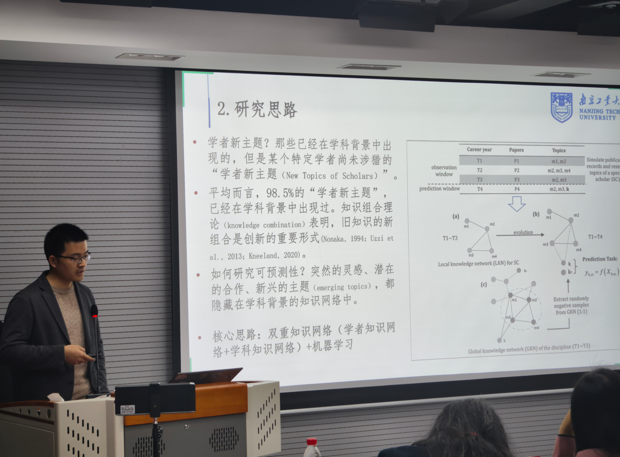 杨冠灿的主旨报告题为“动态视角下的技术会聚演化机制与预测方法”。报告系统梳理了技术会聚的概念发展、测度识别及预测模型的研究进展,聚焦动态视角下的关键问题和研究挑战。他深入探讨了图神经网络在技术会聚预测中的应用,详细介绍了如何在节点新增的动态条件下优化预测模型的适用性,并提出了应对“节点动力学”和“连边动力学”复杂过程的新预测框架。杨冠灿认为,未来的研究需要进一步提升对动态网络机制的理解,以便为技术会聚的实际应用和产业创新提供更强有力的理论支撑和实践指导。