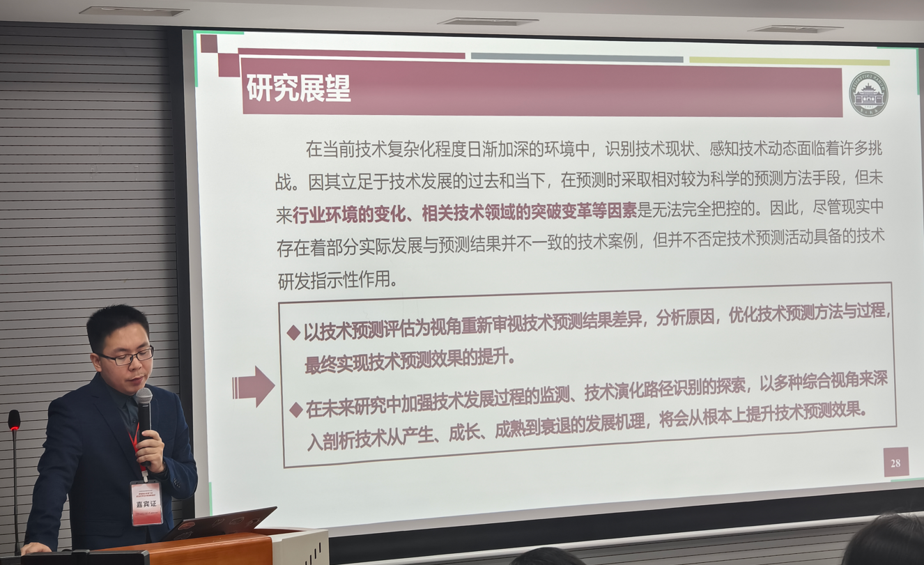 杨冠灿副教授代表会议主办方做了精彩而简练的总结,他表示,学术研究不应只是冷冰冰的文献堆砌,而应是思想火花的碰撞与智慧的传承,吸引更多员工投身于技术预测领域也是本次论坛的要义。此次会议聚焦学科前沿,多位嘉宾分享了其最新研究成果,其中一些内容甚至尚未公开发表,这不仅让与会的老师和同学能够切身感受到学科发展的脉搏,更展现了学者们对知识共享与学术交流的真诚态度。对于科技预测与战略决策服务的未来方向,杨冠灿提出,希望进一步增强国际学术影响力的目标,同时呼吁开发更高效、直观、精准的工具,助力国家战略布局与学术智慧传播。最后,杨老师表达了对“科学与技术预测前沿学术论坛”持续举办的期望,希望通过这一平台进一步推动学术交流与学科创新。