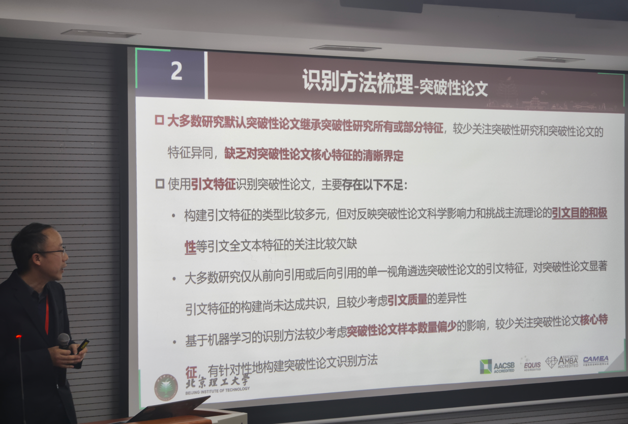 毛进的主旨报告题为“Dynamic Heterogeneous Graph Fusion Networks for Citation Intent Classification of Scientific Publications”。他基于复杂网络视角,构建了科学知识系统的分析框架,提出了“引用动机分类”的研究任务,即分析和预测引用所蕴含的背景描述、方法支持、结果对比等意图。结合引用位置、作者和前后向引用构建动态异构图网络模型,并在计算语言学和医学领域数据上进行性能检验。毛进强调了关系的结构特征对于提升任务性能的关键作用,并展望了未来将引用关系与大模型相结合的可能性。