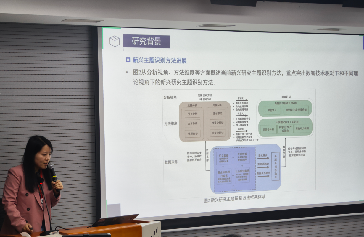 许海云的主旨报告题为“新兴网络结构变迁过程的弱信号早期识别方法”。她回顾了弱信号理论的发展,指出弱信号通常呈现出低频、碎片化、不确定等特点,难以通过传统方法进行有效识别,因此弱信号的早期识别对于预见技术变革和科技发展趋势至关重要。通过动态时间规整和突变检测等方法,可以探索新兴研究主题的演化模式,揭示科技创新主题从早期信号到成熟应用的多阶段特征。许海云展示了知识类型序列演化过程突变在再生干细胞领域的实证成果,并呼吁通过进一步研究拓展弱信号的语义层面分析。