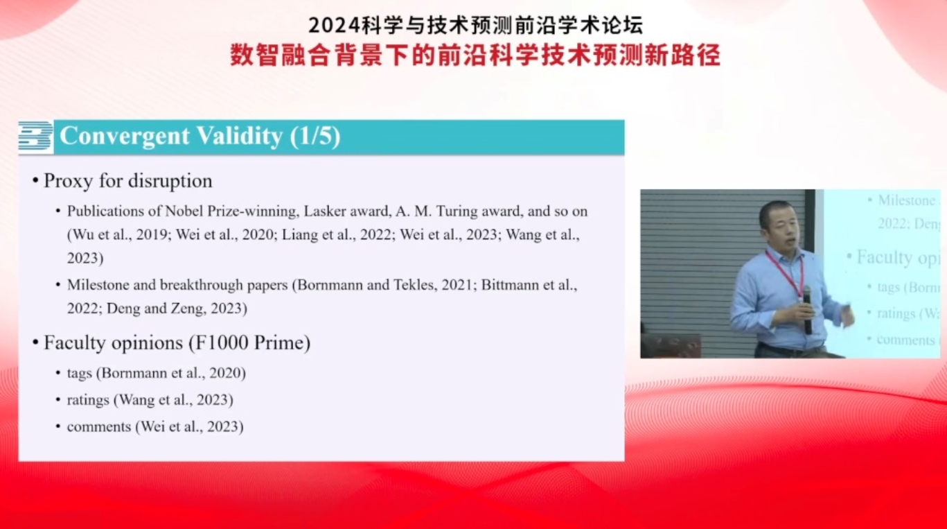 汪雪锋的主旨报告题为“突破性/颠覆性技术识别初探”。他探讨了突破性技术和颠覆性技术的研究视角,包括技术本身和市场、行业乃至国家战略层面的变革。汪雪锋对现有的突破性技术和颠覆性技术的识别方法进行了梳理,包括文本挖掘、机器学习、文献计量、综合指标分析等。报告进一步分享了颠覆性指数的改进、生物医学领域突破性论文的识别、围绕跨领域融合应用的颠覆性技术识别的案例。汪雪锋建议未来的研究应注重阐释突破性技术形成的机理,探究影响突破性技术形成的因素及差异化路径。