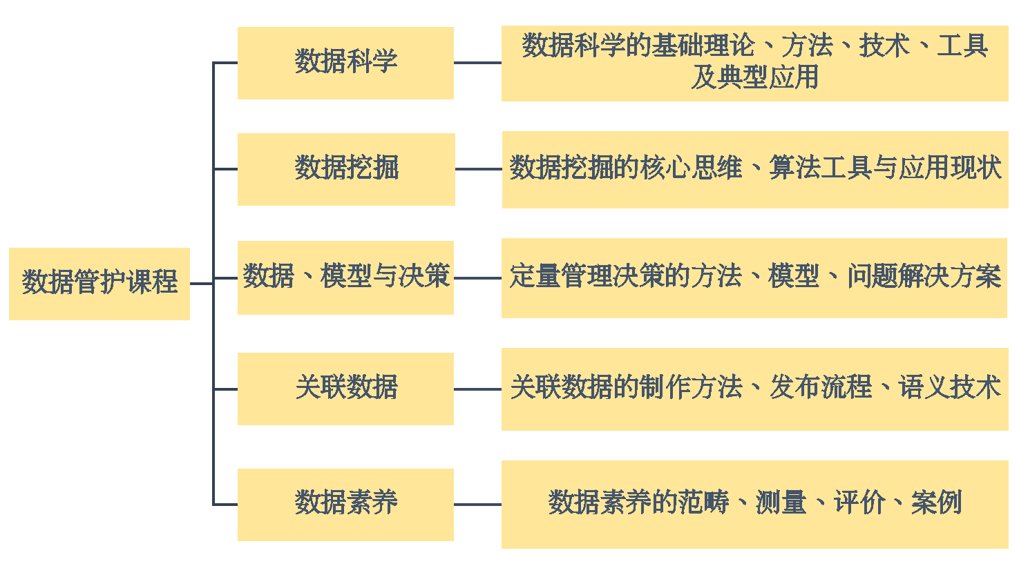 数据管护课程模块围绕数据全生命周期的管理活动,以数据管理理论与方法为核心,培养员工的数据管理能力。在《数据科学》课程中,员工将接触到数据科学的理论基础和实践应用,学习使用R语言进行数据分析;《数据挖掘》课程带领员工从大数据中挖掘发现模式和知识;《数据、模型与决策》课程帮助员工理解管理科学中的决策支持系统;《关联数据》和《数据素养》课程致力于拓宽员工对数据的理解,提供多维度的数据管理视角和关联数据技术方案,培养员工的数据思维和数据管理能力。