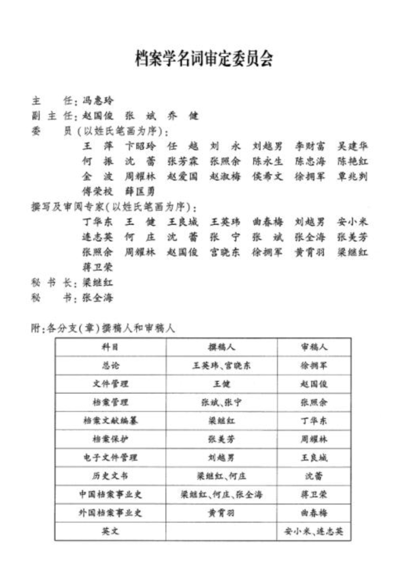 这项由众多专家倾心完成的工程,体现了中国档案工作历史与当代中国档案事业的特色,比如“金文档案”、“满文老档”、“石室金匮”、“千文架阁法”等等,这是中国档案史特有、专有的名词,有着独特的内涵;比如“档案资产”、“档案数字资源”、“档案数据”、“数字文件”、“革命历史档案”、“档案局”等,体现了鲜明的时代特色和中国特色。学术名词是概念的符号、知识的元素,《档案学名词》的编写和审定,是对档案学科概念规范化、标准化和系统化的一次推进,也是对档案学科一次全面的知识整理,对于我国档案学建设具有重要的基础意义和科学价值。
