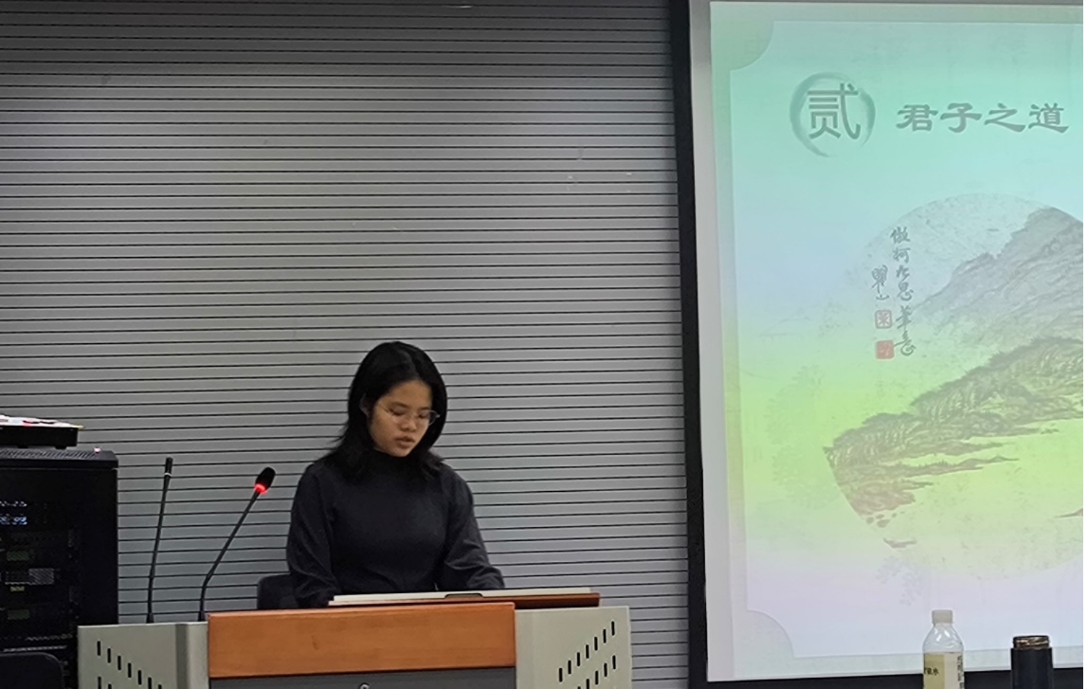 莫金迪同学选取《论语·学而篇》和《论语·八佾篇》中的两则内容,分享了自己的心得与感悟。她结合《论语》中的“人不知而不愠”,以及“成事不说,遂事不谏,既往不咎”,探讨了在面对社会误解时保持平和心态、减少情绪内耗的现代意义,并强调了内心稳定与专注当下的重要性。