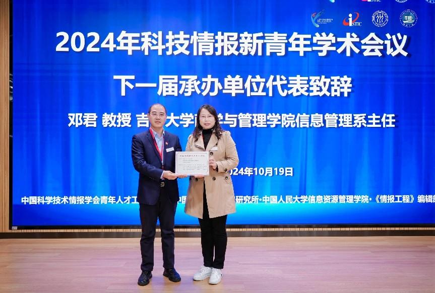 会议最后举行了交接仪式,刘志辉主任将2025年会议的主办权交给吉林大学商学与管理学院信息管理系系主任邓君教授。邓君教授展望了2025年即将在吉林大学举办的第四届科技情报新青年论坛,期待在场嘉宾和与会人员继续参加。